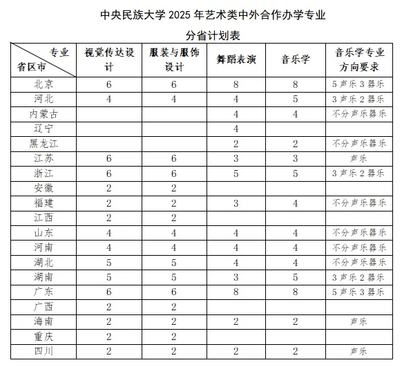 据教育部相关批复精神,中央民族大学2025年继续面向全国部分省(区、市)招收艺术类中外合作办学专业四年制本科生240名,特制定本招生简章。